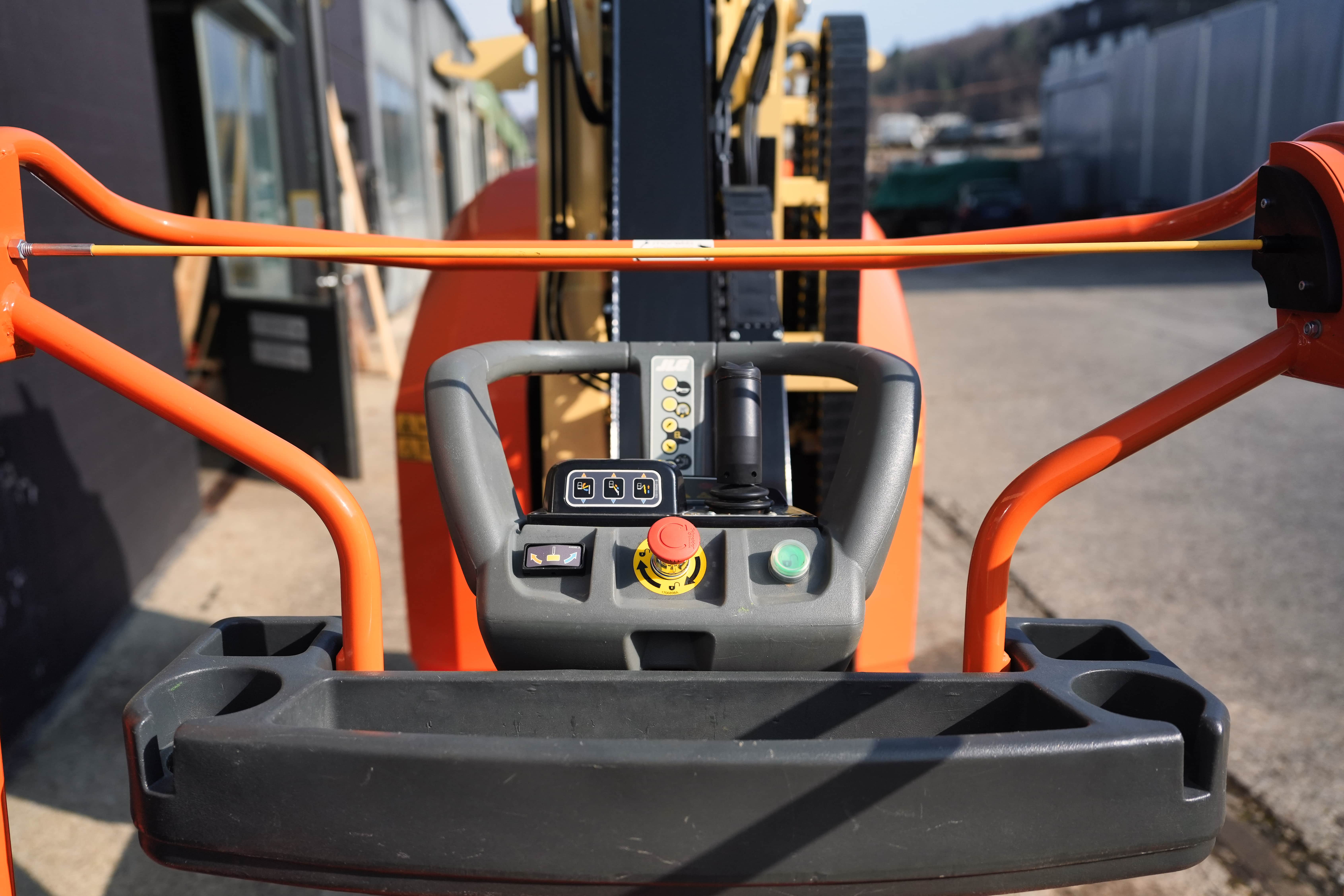 Die JLG Toucan 12E Plus bietet eine maximale Arbeitshöhe von 12,65 m bei einer Nutzlast von 200 kg. Die seitliche Reichweite beträgt bis zu 6,05 m, und der Korbarm misst 4,14 m in der Gesamtlänge. Der Hubmast ist um 345° schwenkbar, und der Korb lässt sich von +60° bis –60° drehen. Ein voll proportionaler Joystick ermöglicht präzise Fahr- und Hubbewegungen, ergänzt durch zwei Mini-Joysticks für eine proportionale Steuerung von Mast und Korbarm. Mit einer Gesamtbreite von nur 1,20 m, einem äußeren Wendekreis von 2,60 m und nichtmarkierenden Reifen ist sie ideal für enge Gänge und Innenbereiche. Der elektrische Antrieb sorgt für emissionsfreien und nahezu geräuschlosen Betrieb, während sofort ansprechende Drehstrom-Antriebsmotoren für höheres Drehmoment und mehr Effizienz sorgen.